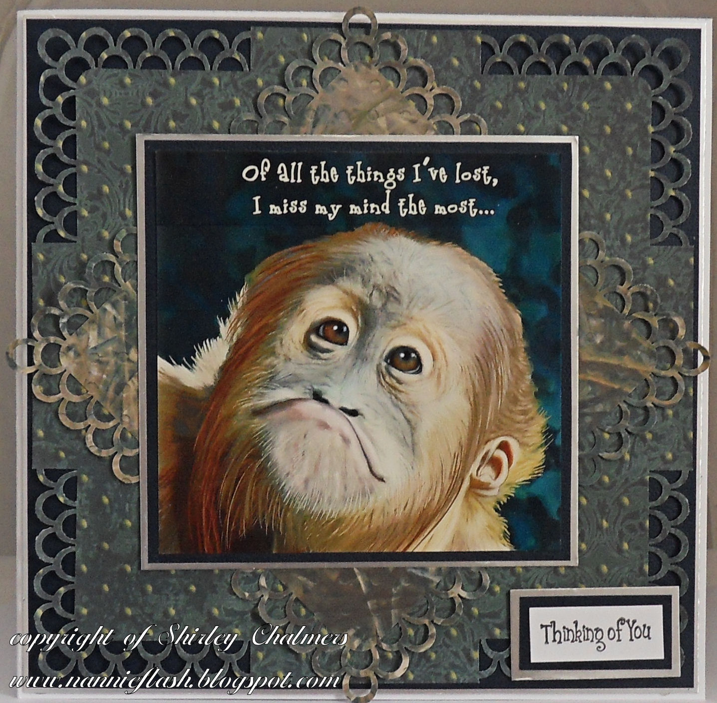 Anyway heres my second sample for Sarah, he makes me smile and thought it would make a lovely "Thinking of You" card, especially if your feeling a bit down. I have printed it again onto photo paper and used two of the backing papers for the front and have also used a Martha Stewart border and corner punch to give it a bit more punch. I do hope you like it.